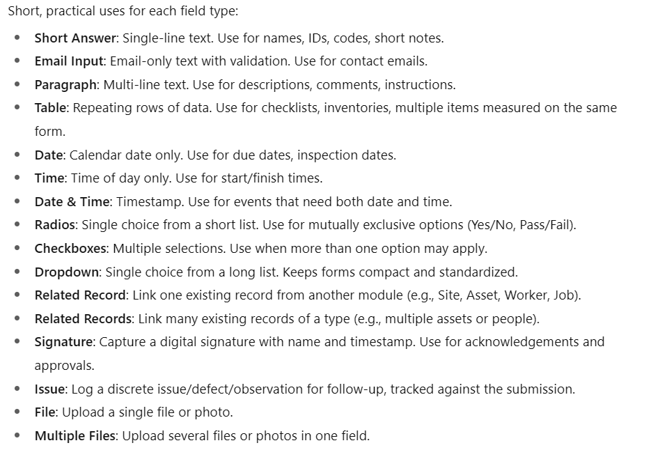 In this video, I walk through our client-facing custom form builder. I demonstrate how to set up various sections, input types, and submission actions, including sending an email to a supervisor upon form submission. Please check the article linked below for additional details on the different field types available.